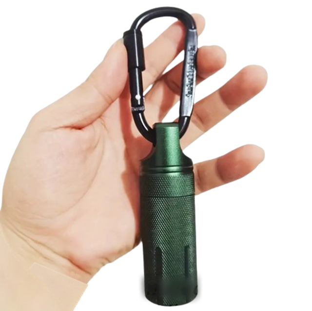 Ce pack comprend un conteneur étanche en alliage d'aluminium de couleur verte et un mousqueton pratique de couleur noire.