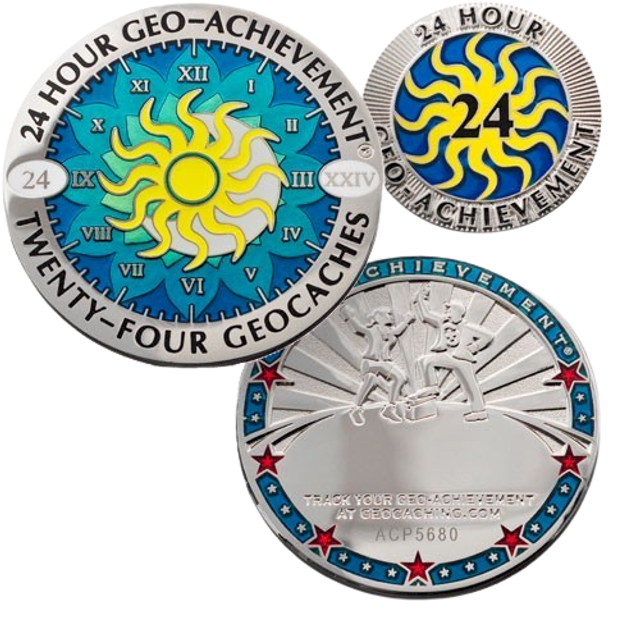 Félicitez une performance exceptionnelle avec ce Géocoin conçu pour les géocacheurs ayant réussi à trouver 24 caches en 24 heures !