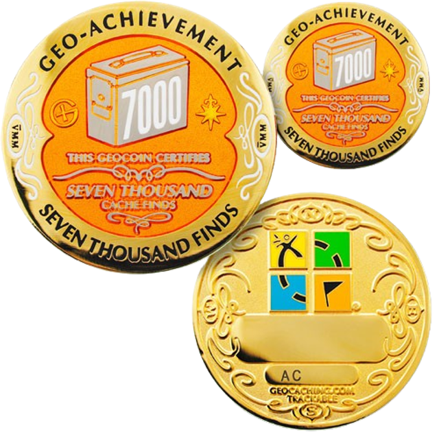 Géocoin "7000 caches trouvés" + Pin's assorti – Édition spéciale