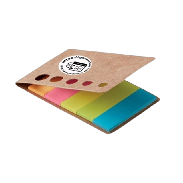 • Bloc-notes rigide avec une couverture soignée et un assortiment de post-it multicolores à l’intérieur.