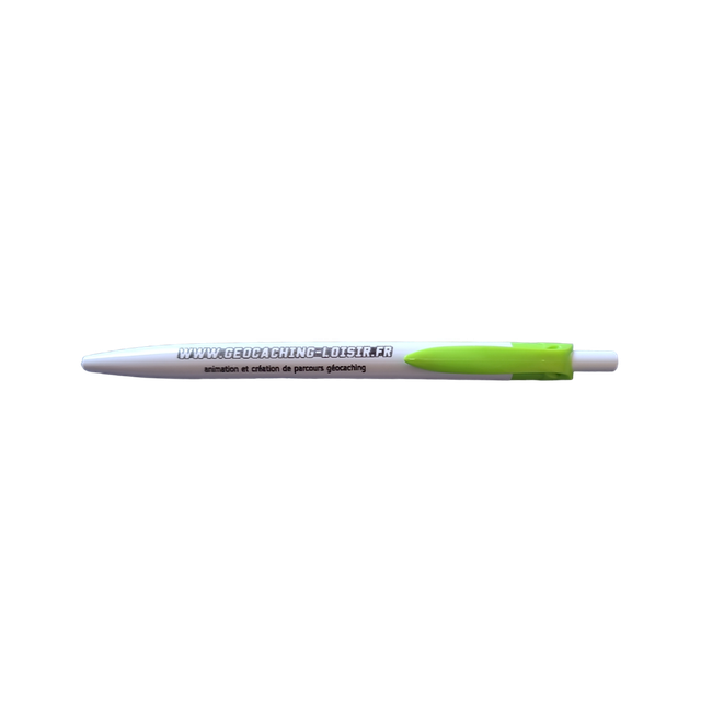 Offrez un cadeau pratique et élégant avec notre stylo bille bi-couleur, composé d’un corps en plastique ABS de haute qualité. Disponible en blanc et vert clair, ce stylo est idéal pour un usage quotidien ou comme cadeau à un géocacheur.