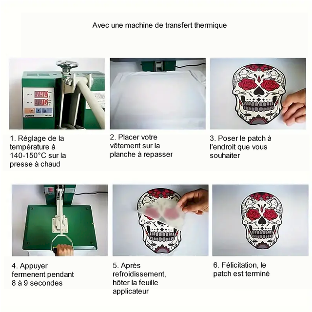 - Se fixe facilement à l’aide d’un fer à repasser ou d’une presse à chaud.